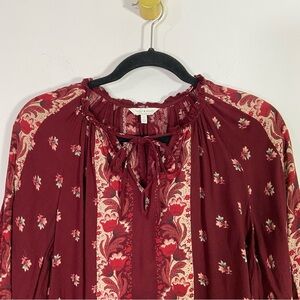 Lucky Brand top. Red with floral and paisley printed design. Long sleeve cinched at wrist. Raglan sleeve. Relaxed fit. Split crewneck with tie detail. In excellent preowned condition. Measurements while flat approximately 19” bust and 23” length. Size small.