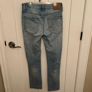 Trendy slim-fit jeans with a distressed design. Light blue shade for a modern look. Stretchy & comfortable, 28x30. Shop my Closet to add to your bundle. Bundle 2 or more items and save 20%, fast shipping! Top-rated seller, Posh Ambassador. ✅️ Bundle and save on 2+ items ✅️ Smoke-free home ✅️ Fast Shipping ✅️ Offers welcome