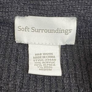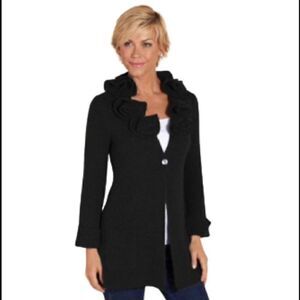 Soft Surroundings black alpaca blend rosette cardigan sweater size M. Style 23440. Rosettes around the neckline. Single button front. Front pockets. Like new condition. 71% acrylic 22% alpaca 7% wool. Length 32” Chest 20”.