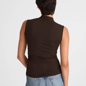 Madewell sleeveless mockneck top in a rich chocolate brown shade, crafted from a soft cotton and modal blend with a hint of stretch. This versatile piece features a flattering slim fit with subtle side ruching that adds texture and a modern silhouette. Designed with a clean mock neck and a straight hem, it serves as an ideal base layer or a standalone staple for transitional weather.