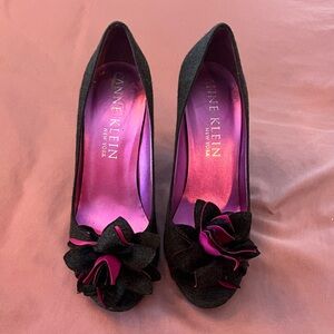 Elegant black heels with striking purple interior. Features a stylish floral accent. Perfect for any occasion.