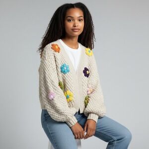Chunky knit cardigan features a playful array of 3D crochet floral appliqués in vibrant colors against a neutral cream backdrop. This open-front sweater is designed with a relaxed, slightly cropped fit and voluminous balloon sleeves, creating a cozy yet statement-making silhouette. The thick basketweave texture adds substantial weight and warmth, while the colorful flowers provide a whimsical, handcrafted aesthetic perfect for layering over simple tees or dresses.