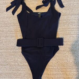 Ribbed fabric. 82% polyester. Built-in shelf bra. Tie shoulder straps. Removable belt. Moderate coverage. Worn once.