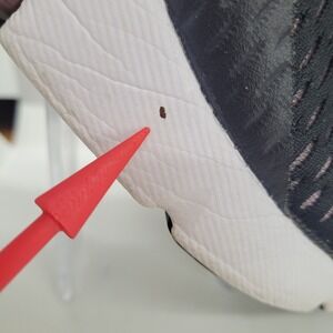 Visible in photos are a small dark mark on the white midsole and scuffing on the heel counter as indicated by the red pointers. Nike Air Max 270 lifestyle sneakers combine a breathable mesh upper with a large Max Air unit for responsive cushioning. These shoes feature a sleek black silhouette with a translucent pinkish-purple air bubble at the heel. Stretchy inner sleeve for a snug, sock-like fit, while the durable rubber outsole provides traction.