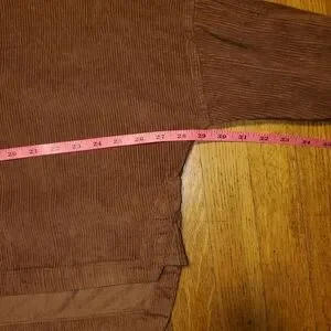 I love brown corduroy in the fall! Extra wide across but cropped length. The front is slightly shorter than the back. Buttons up the front to the collar and at the cuffs of the sleeves.