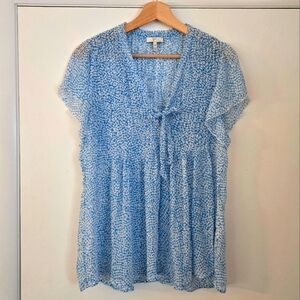 Joie 100% Silk Blue And White Tie Neck Short Sleeve Flutter Top