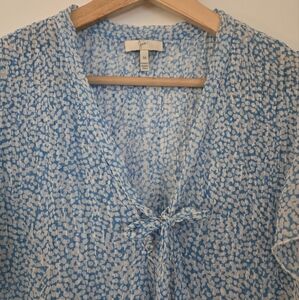 very good used condition, size medium by Joie. 100% silk semi-sheer top with short flutter sleeves. tie neck and button detail. light blue and white pattern.