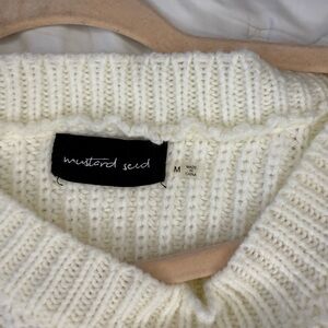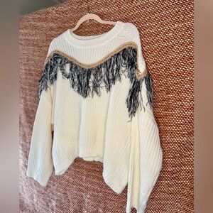 This is a Mustard Seed cable knit fringe pullover sweater in cream.