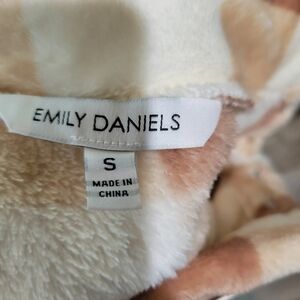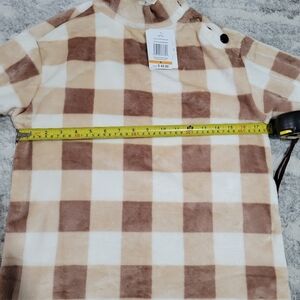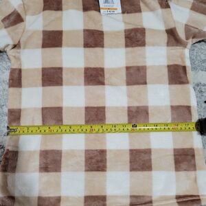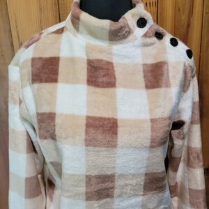 Cozy plaid sweater with button details on the shoulder. Features a stylish checkered pattern in cream and tan.