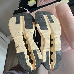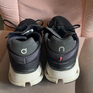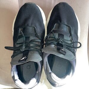 Sleek black athletic shoes with white soles. Designed for optimal comfort and performance. Ideal for active wear.