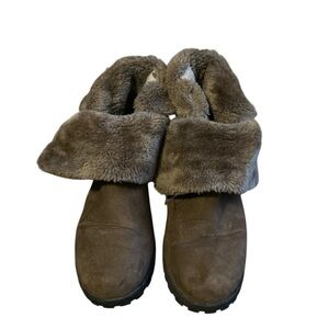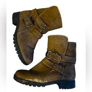 Women's brown suede ankle boots. Features double buckles and a faux fur lining. Durable rubber sole. Needs cleaning .Size 7.5.