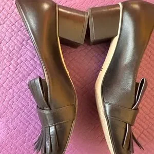 Like new and authentic. Gucci loafers with fringe detail. Sleek black leather. Iconic gold hardware accent. Heel is 2 inches.