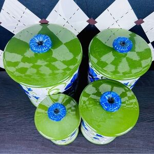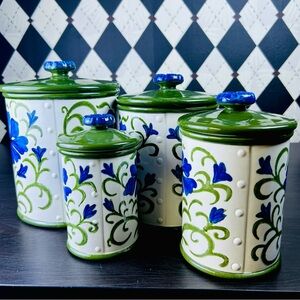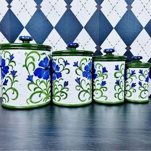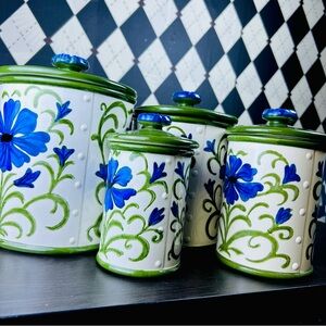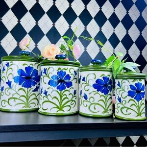 Metlox Poppytrail Blue Floral Canister Set, Green Lids, 4pc Vintage Very Large