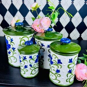 A complete four-piece Metlox Poppytrail canister set in crisp white ceramic, animated by cobalt blue florals and scrolling green vinework. Sculpted dot relief panels and saturated emerald lids give the set architectural structure rather than cottage softness.