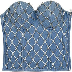 Women's Denim Corset Top Rhinestone Strapless Padded Supportive Party