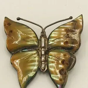 Gorgeous vintage butterfly brooch made in Mexico (Taxco?) from 925 sterling silver and abalone/shell. See photos for size.