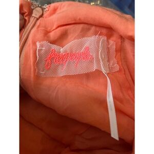 This stunning Free People "Vibe Check" maxi dress features a vibrant orange and coral floral print. It has a full button-down front, a flattering sleeveless bodice, and a flowy, voluminous skirt that creates beautiful movement. Perfect for beach vacations, summer weddings, or festivals.