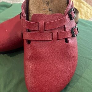 Stylish red leather clogs featuring buckle detail. Perfect for casual wear. Excellent shoes in great condition by Birkenstock worn one time