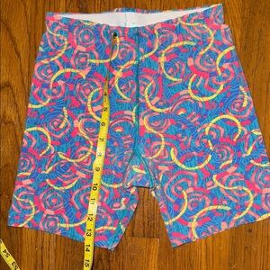 Vibrant shorts with a colorful abstract pattern. Features blue, pink, and yellow swirls.