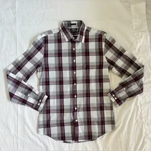 This classic and timeless button down shirt from Express features a slim cut and lightweight fabric in a red and navy blue plaid. Pair this versatile piece with wardrobe favorites for endless possibilities.