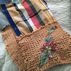 #Handmade #Boho #Bohemian #Patchwork #Scarf #Denim #Crochet #Embroidered #Cottagecore #Unique #OneOfAKind #Upcycled #DenimScarf #KnitScarf