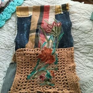 Handmade boho patchwork scarf featuring a mix of textures and patterns, including soft crocheted sections, denim panels, and plaid fabric. The patchwork design is accented with colorful embroidered floral patches and a small pink button detail. Wash on gentle. Pre-washed and pressed.