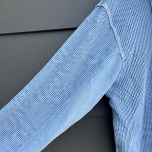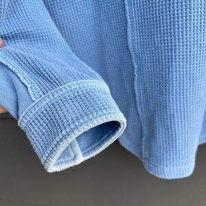 Light blue waffle knit shirt with a soft texture. Features a classic design. Some wear on edge of cuffs - great overall condition - M Oversized Cotton 60%/Polyester Approximate measurements:- PTP 27” Length from shoulder 28” Sleeve length from pit to cuff 19”
