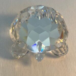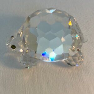 A rare collectible crafted from authentic Austrian crystal. Perfect for lovers of fine crystal art, this charming turtle adds elegance and whimsy to any space. Its intricate design and sparkling clarity make it an eye-catching piece that beautifully captures light from every angle. The turtle’s eyes are small green crystals. It measures approximately: 2.25 inches long x 1.75 inches wide x 1.125 inches high. It has always been stored in the box -- never displayed. It is therefore in excellent condition with no chips, cracks or repairs, and it comes complete with its original box and Certificate of Authenticity (COA). Inner box is in mint condition; outer protective sleeve has some visible wear.