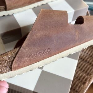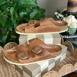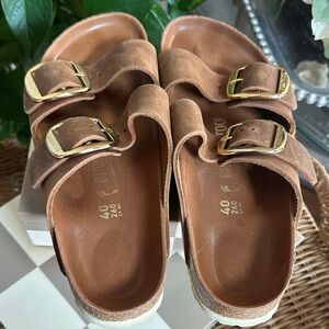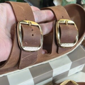 Birkenstock Brown Leather Arizona Sandals with Gold Buckles