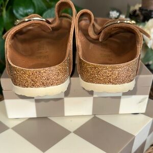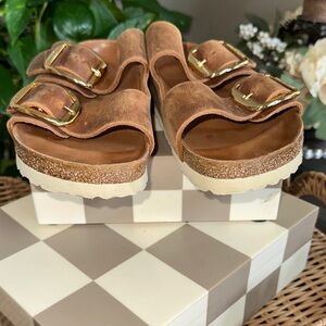 Stylish brown leather sandals. Features gold buckles. Signature Birkenstock comfort.