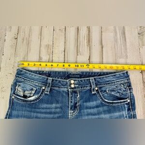 The product is a pair of Vigoss Women's Capri The New York Jeans in a size 15/16. These denim jeans feature a mid-rise waist, a 5-pocket design, and a rhinestone accent. The distressed style, along with the solid blue color, makes them perfect for wearing in the summer, fall, and spring seasons. The jeans have a regular fit and are made from a blend of spandex and cotton, offering a comfortable and stylish option for women looking for a trendy addition to their wardrobe.