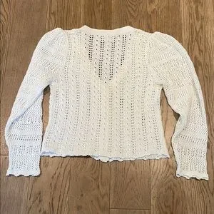 This is a fully fashioned V-neck cardigan with puff sleeves. It’s made with midweight all-season cotton yarn that’s soft to the touch. It’s constructed using a Crochet stitch with a looped knit pattern for a textural look and airy feel.