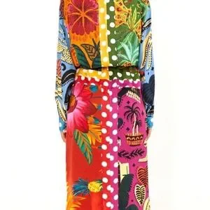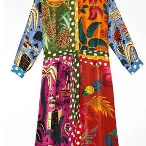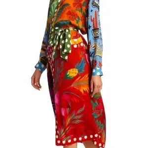 Farm Rio's Early Rainbow midi-shirtdress combines bright print mixing with contrast dot trim. Designed with a silky, non-stretch feel, the Brazilian label finishes this style with a matching self-tie belt. Size Large NWT.