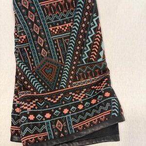 Express mini skirt in size 6 featuring a trendy western boho pattern with an eye-catching faux leather band along the bottom hem. This statement piece blends rustic western vibes with modern edgy style, making it perfect for concerts, fall festivals, rodeos, country nights, or everyday casual looks. The flattering mini length pairs effortlessly with boots, oversized sweaters, or a fitted top for a chic, fashion-forward outfit.