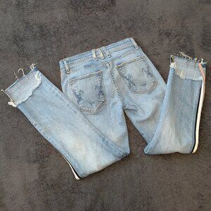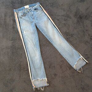 McGuire side stripe ribbon jeans with frayed front hem. Light wash with distressing.