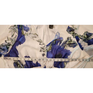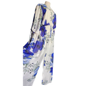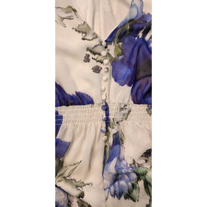 Stunning lightweight chiffon dress from Taylor Woman in a beautiful bold blue and purple floral print on a white/cream base. Features a sheer overlay for airy elegance, fully lined (100% polyester shell and lining), puff/volume 3/4 sleeves with tie accents, V-neck with decorative button front detail, elastic smocked waistband for flattering cinch, and a flowy front slit hem for movement and style.