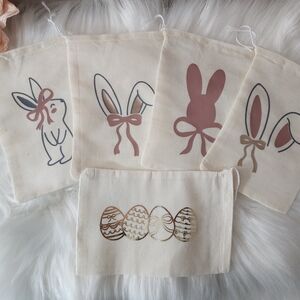 Adorable cotton bags featuring Easter bunny and egg designs. Perfect for kids' and adult accessories and treats. Comes in cream, pink, rose gold, gold, and gray.