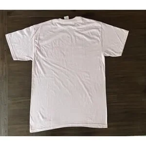 Pre-owned T-shirt with cotton fabric clean and intact and front graphic bright. Light wrinkling from storage with no holes or stains.