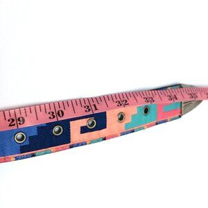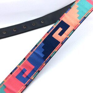 Gorgeous VINTAGE NUOVO SOUTHWESTERN WESTERN BELT with bold Aztec geometric print in coral pink, teal, navy and turquoise tones. Features antiqued silver tone engraved Western buckle, keeper and tip with classic etched detailing. Canvas printed overlay with dark backing. Silver tone hardware throughout.