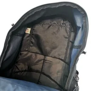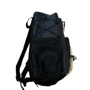 Spacious main compartment with a dedicated pocket for a phone or music device and a top opening for earphones. Exterior includes bungee cords on each side to secure items and two mesh side pockets for water bottles. Adjustable shoulder straps and a clear ID window on the back for a name tag.