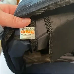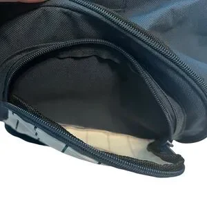 Features two front zippered pockets. The lower pocket measures approximately 9 x 9.5 inches and includes pencil holders, a flap pocket, and storage space. The upper pocket measures approximately 7.5 x 5 inches with open storage.