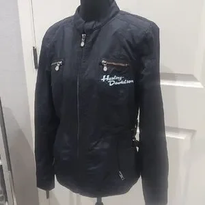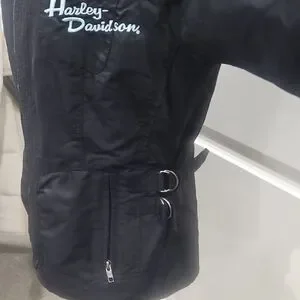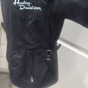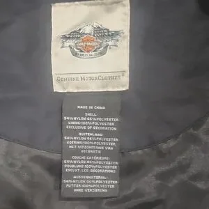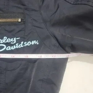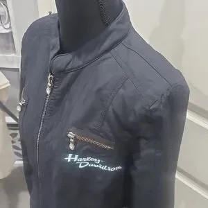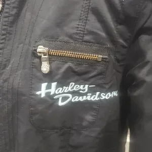 Bold Harley-Davidson bomber jacket with striking graphics. Features iconic motorcycle design and vibrant text.