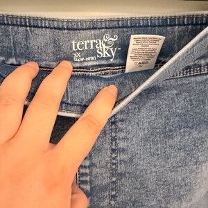 Chic straight leg jeans by Terra & Sky. Light blue hue. Perfect for casual wear.