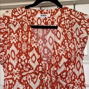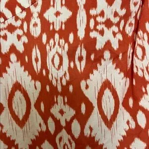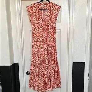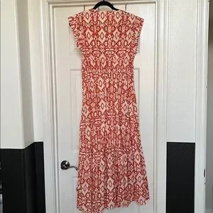 Chic maxi dress with vibrant orange and ivory pattern. Flattering fit with cap sleeves