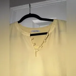 Chic and breezy Calvin Klein blouse. Features delicate pleated sleeves. Ideal for casual or formal wear.
