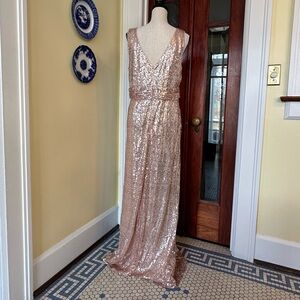 NWT. Floor length sleeveless V-Neck formal gown covered in rose-gold sequins. Zips at center back.