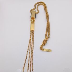 Stylish gold tone chain with a sleek Y design. Ideal for elevating any look. It does have some minor surface scratching. It measures 19-21.5 inches long... N94