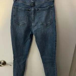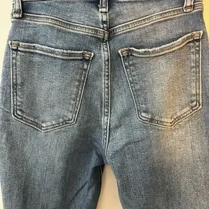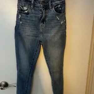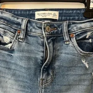 Light blue jeans with distressed details. Classic five-pocket style. Button and zip closure. A&F Curve Love fit. Super soft and stretchy. In great condition! The length is approximately 28-29in.