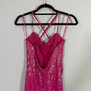 Fashion Nova mini dress. Hot pink sequins. Ruched skirt. Backless. Cross-crossed, adjustable spaghetti straps. Size medium. In excellent preowned condition. Measurements while flat approximately 15” bust, 12” waist, and 29.5” bust.