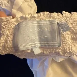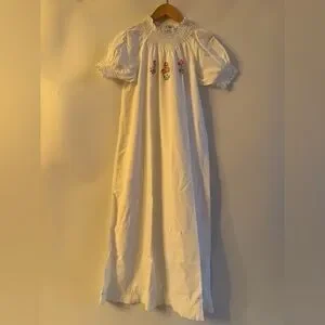 Hill House Home Caroline Nap Hand Embroidered Dress Size Small, white cotton with hand embroidered flowers, smocked neckline may be worn off shoulders if preferred, short puff sleeves with smocking and sweet ruffles, ruffles trim on bottom hem, drop shoulders and sleeves, lightweight and comfortable, 100% cotton with no stains, no holes, no damage, smoke/pet free.